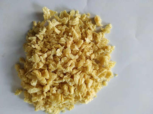 組織蛋白有粒狀、塊狀、片狀、絲狀等不同形態(tài),呈不同深淺的黃褐色,其網(wǎng)狀結構成定向排列,形成具彈性、韌性的纖維束或積層,使在食用時(shí)有類(lèi)似肉食肌肉組織的咬勁。典型的組織蛋白含蛋白質(zhì)60%左右??捎米鞣氯庵破返募±w維材料。